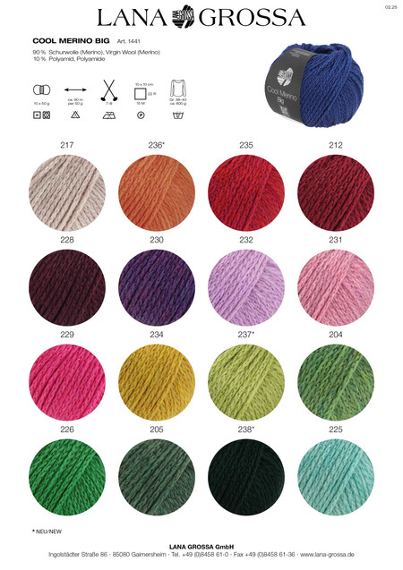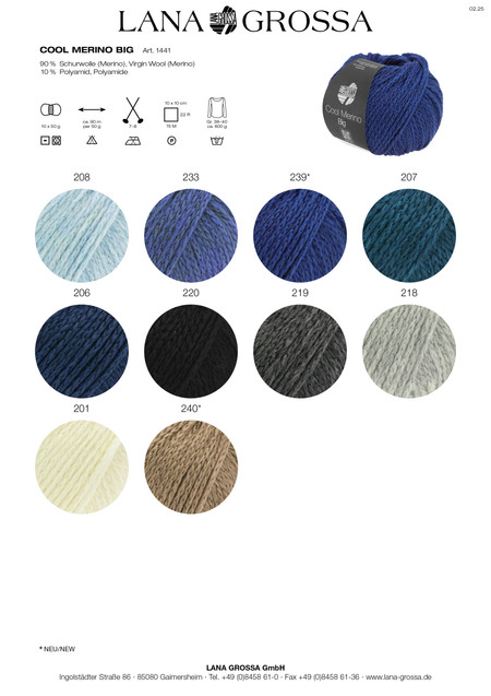 A Cool Merino Big, a tavaly népszerű Cool Merino vastagabb testvére, egy szövött, avagy strukturált szálas fonal, ezért nagyon könnyű vele dolgozni, ami miatt kezdőknek is melegen ajánljuk. Anyaga 90% természetes merinógyapjú és 10% poliamid.
