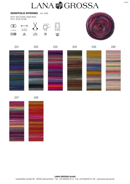 Intenzív színátmenetek, határozott csíkokkal a Gomitolo-sorozatban megszokott 200 grammos gombolyagban. Egy gombolyag elég egy meleg sálra, 2 gombolyag akár egy pulóverre is.